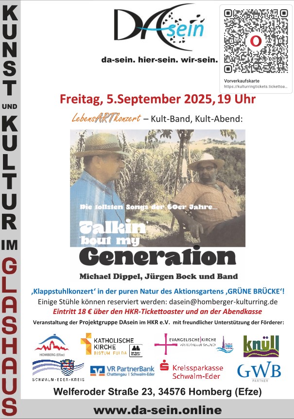 Galerie GLASHAUS Welferoder Str. 23, Homberg (Efze)Klappstuhlkonzert in der puren Natur des Aktionsgartens GRÜNE BRÜCKE - witterungsbedingter Wechsel ins GLASHAUS möglich: Ein Abend voller Vokalklänge: „Die Welt ist bunt“VocaYou, A-capella-Band aus Berlin "VocaYou“ (Miriam, Sylvia, Jenny, Jonas und Eugen - fünf Sänger:innen aus Berlin und Potsdam) gestalten unter dem Motto "Die Welt ist bunt!" ihre musikalische Welt so vielfältig, wie sie […]